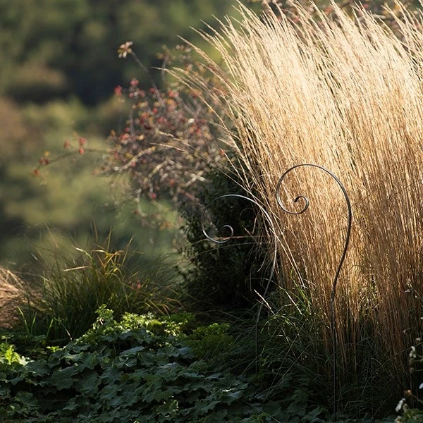 Inspired by the metal scrolled ends of Victorian park benches, these flat bar section steel stakes make useful hooks planted in borders to hang bird feeders or ornaments.