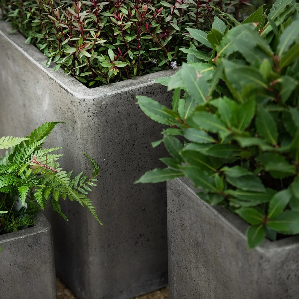 These cement grey cube planters bring an urban contemporary feel to the garden. Simple and clean, they make a great neutral canvas to show off a green display. The pots are available in three sizes, useful for solo specimen plants or arranging in multiples.