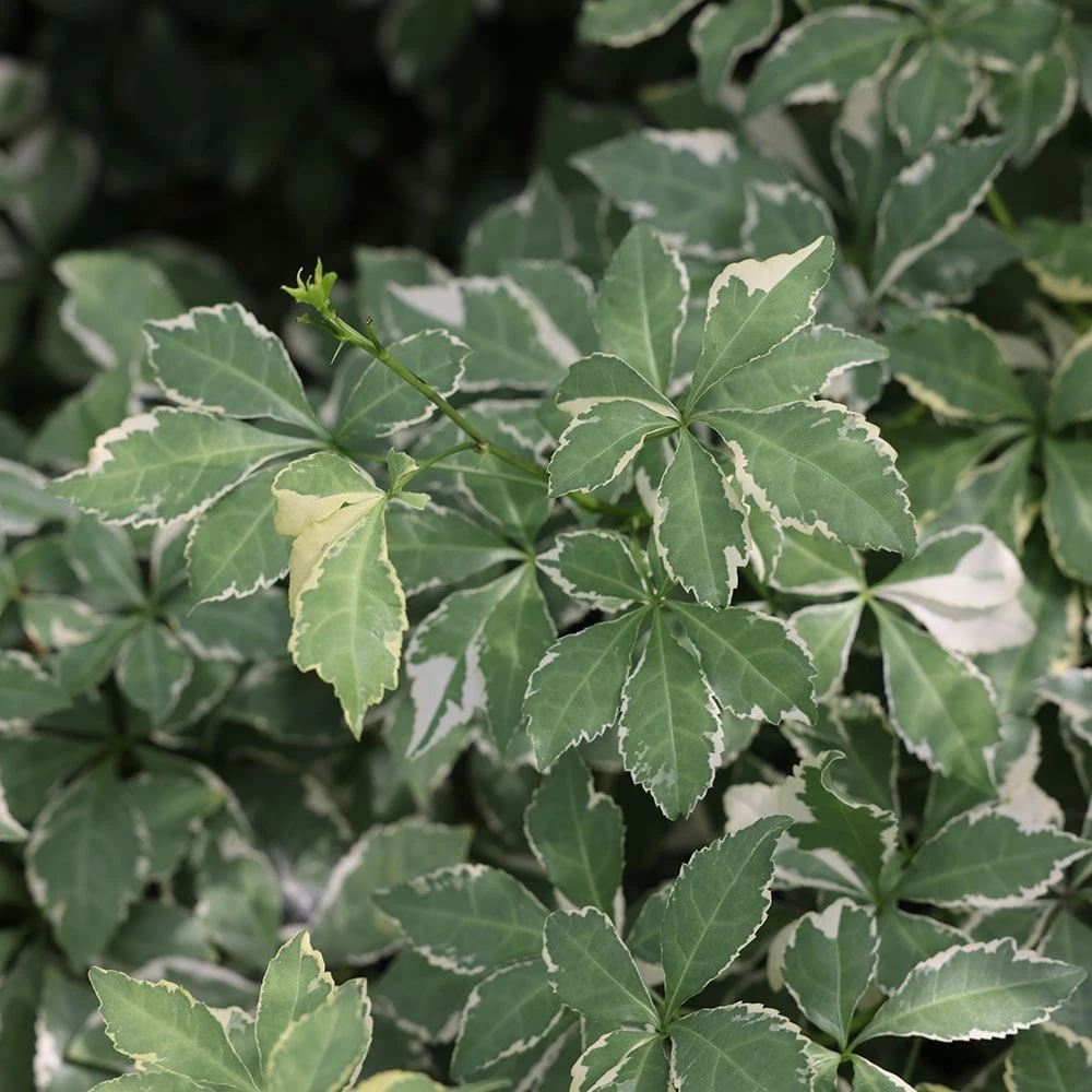 An excellent foliage shrub for shade gardens, shrub borders or screening, with small greenish-white flowers appearing in globe-like umbels in spring, remeniscent of ivy flowerheads. Flowers on female plants (species is dioecious) may give way to small black berries, but most plants sold in cultivation are females so fruit is rarely seen. ‘Aureovariegatus’ features striking variegated foliage in which the five-fingered palmate leaves are bright green edged with white. With small, sharp thorns, it also makes a good defensive hedge, and is tolerant of drier conditions (once established), urban environments, and poorer soils.