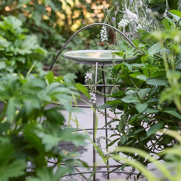 Support taller perennials and provide a pit stop for thirsty birds with this elegant support. Made from 7mm steel rod with an antique pewter finish, the sturdy frame features 6cm-high feet that can be pushed firmly into the ground to anchor.