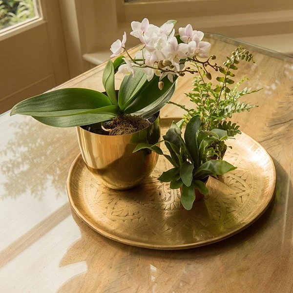 Vintage-style pot tray made from solid brass with a hand-etched design inspired by antique Indian vases. Perfect for displaying small potted cacti, succulents, etc. Designed with a rolled edge for easy carrying and no drainage holes for use indoors.