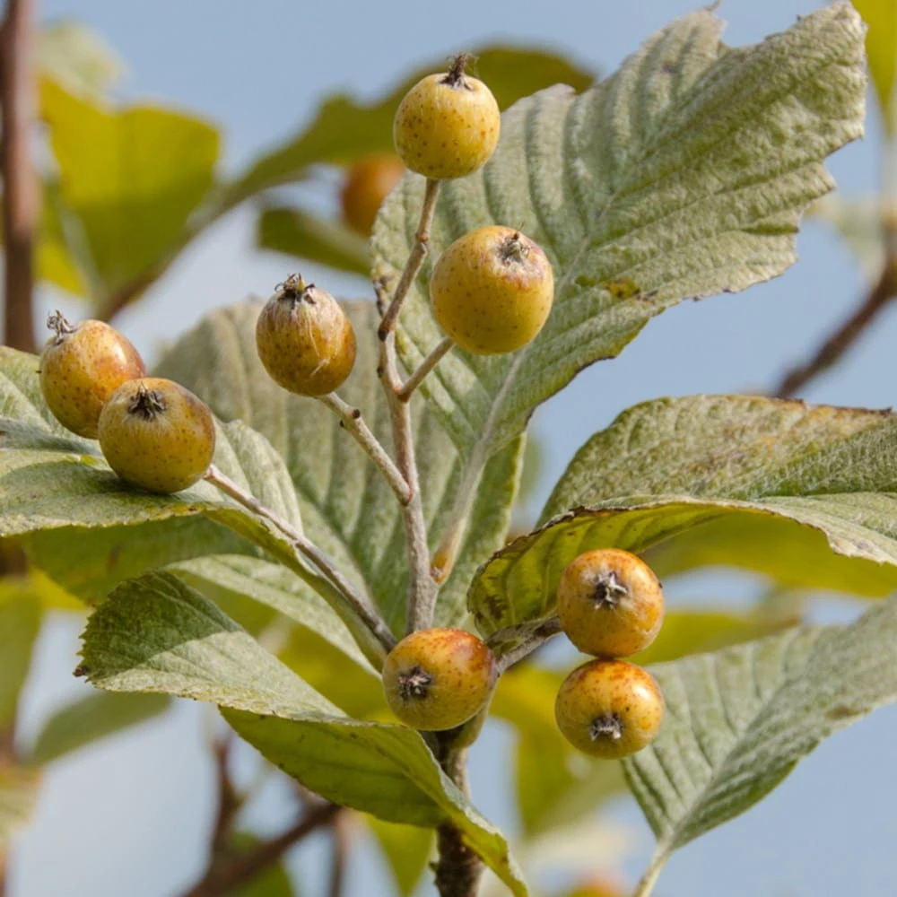 A rare and hardy ornamental tree offering year-round interest for neutral to acid soils. In spring, its young leaves are silvery-grey and downy, maturing to a vibrant green with sparsely hairy undersides. Clusters of creamy-white flowers bloom, attracting wildlife to the garden. As summer turns to autumn, the tree bears amber-orange fruits, speckled with greyish-brown, providing a vital food source for birds. With its compact, upright growth, Sorbus wardii is an ideal choice for smaller gardens.
